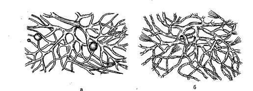 На рисунке слева (а) ценотический мицелий, слева (б) септированный мицелий.