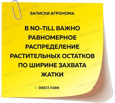 Важно при переходе на No-Till - это равномерное распределение растительных остатков по ширине захвата жатки (при использовании жаток шириной 9 метров этого сложно достичь) или же использование очёсывающей жатки, она же, в большинстве случаев, решает вопрос с заминанием растительных остатков в семенном ложе, а это очень важно! Так как продукты разложения соломы - бензойная, кумаровая и ванилиновая к-ты в значительной степени угнетают рост корневой системы, часто вызывая хлороз.