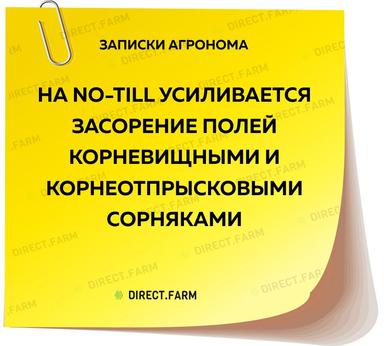 - На ноу-тилл усиливается засорение многолетними корневищными и корнеотпрысковыми сорняками за счет отсутствия вспашки или глубокого рыхления, которые частично подавляют развитие многолетних сорняков.