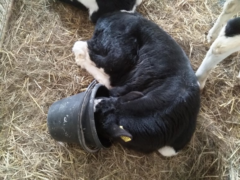 Есть такая примета: если кошка закрывает нос лапой, то это к холодам. Похоже, что наши телята тоже предсказывают погоду, и то, что он спрятал мордочку в ведро (не известно как его вообще достали) обозначает приближение дождей😀 А может быть он просто испугался ветврача😃