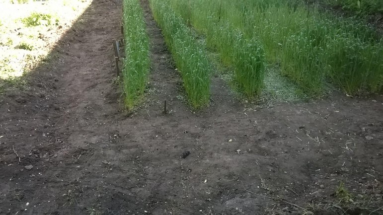 Настоящие работы проводятся на опытном участке Бийского технологического института на кафедре машин и аппаратов химических и пищевых производств (заведующий кафедрой М.А. Ленский). И поскольку группа разрабатывает технологии обогащения семян минеральными элементами питания, что является ключем к переходу на биологическое земледелие, то предложенный способ посева по нашей идее мог быть использован еще и для дополнительного выращивания зеленого удобрения одновременно с основной культурой. При этом 40 % земли используется для выращивания основной культуры и соответственно 60 % для получения зеленого удобрения, масса для которого будет скошена и измельчена в фазу кущения-выхода в трубку, что позволит нам получить дополнительно 0,5-0,8 тн/га сухой массы удобрения, которое в первый год будет являться также и одновременно мульчей, при этом в таком удобрении может содержаться 80-100 кг действующего вещества NPK в пересчете на 1 гектар, и это без учета биомассы корневой системы.