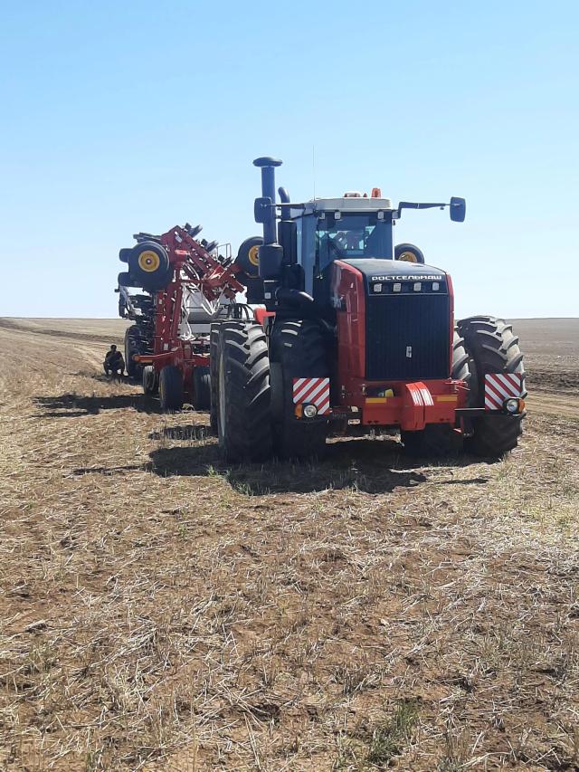 Весной этого года приобрели тракторы РСМ-2375 (как бы Buhler Versatile 2375), но уже не совсем он самый, собираемые в г. Ростов-на-Дону. Завод не успевал с поставками, но мы все же к 5 мая получили свои долгожданные тракторы. Заблаговременно до этого уже произвели сборку ПК Bourgault 3720 c пневмобункером Bourgault 8450. О нем немного подробнее. Дискач. 15 метров. 65 сошников. 65 цилиндриков придавливания. И мощная рама (что характерно Bourgault). Бункер, почти 16 тыс. литров (в РК только в этом году поступили якобы) с гидравлическим приводом высевающего аппарата. Обошелся нам один такой в 102 миллиона тенге. Все бы ничего. Казалось, осталось зацепиться и все дела. Но с первым выходом в загонку, масло в гидравлике закипело как от огня (115 гр. С) за мин 15. В итоге, куча потраченных нервов, бессонные ночи, эксперименты, выезды сервисных служб и с одной и с другой стороны, которые в конце не горели никаким желанием уже приезжать. Пришлось, работать на плавающем режиме и только по паровому фону (принудительно, не хочет никак)