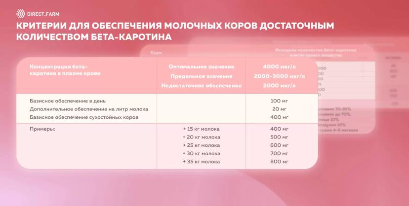 Но у коров с надоями 30 кг и выше с одной стороны, повышенная потребность в бета-каротине, а с другой, в следствии вытеснения основного корма концентратами, снижено его