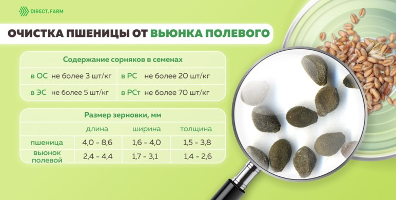 Если не очищать семена яровой пшеницы от вьюнка полевого, то при наличии слишком большом количестве сорняков посев могут признать несортовым. Сортовая чистота пшеницы на ОС и ЭС не менее 99,7%, на РС не менее 98,0% и на РСт не менее 95,0%.