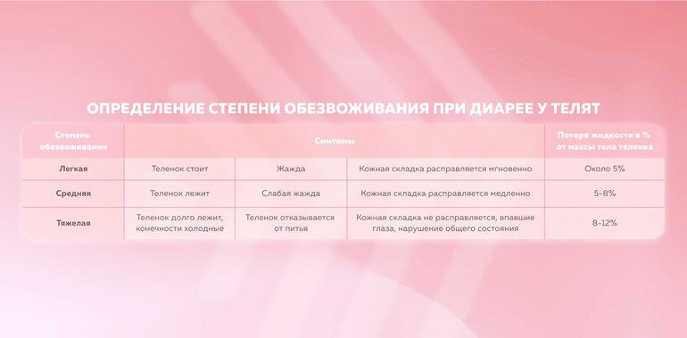Независимо от основной причины диареи, пораженные телята, как правило, не могут потреблять достаточное количество молока и воды, чтобы компенсировать потерю жидкости в организме. Со временем это может привести к легкой, средней или тяжелой степени обезвоживания.