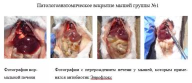В группе мышей, которым применялся антибиотик Энрофлокс, у всех животных был выявлен гепатоз разной стадии. У двух мышей печень была не увеличена, охряно-желтого цвета. У трех мышей печень имела красно-коричневый оттенок с бледно-серыми пятнами, края заострены, полупрозрачные. У двух - орган не изменен. Кроме того, у трех мышей было выявлено катаральное воспаление желудка и кишечника, а у двух мышей наблюдались признаки нефроза - почки имели размягченную консистенцию, характерный рисунок строения стерт.