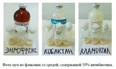 В среде с 50% содержанием антибиотика все мухи погибли. При 30% содержании антибиотиков, в среде с Энрофлоксом и Кобактаном все мухи погибли, в то время как на среде с Кламоксилом LA выживаемость мух достигла 30%. При 20% содержании антибиотика в среде с Энрофлоксом все мухи погибли, в среде с Кобактаном выживаемость мух достигла 30% и в среде с Кламоксилом LA 70%.