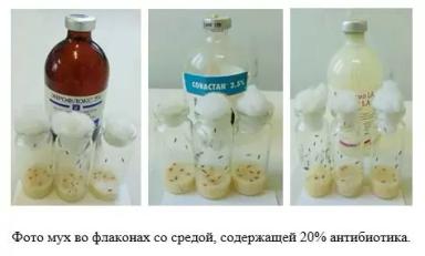 Для определения токсичности антибиотиков на мухах дрозофилах по определенному рецепту (агар-агар, дрожжи, манная крупа, сахар, пропионовая кислота) была приготовлена питательная среда, с добавлением в разных процентных соотношениях исследуемых антибиотиков. На питательную среду были посажены мухи Drosophila melanogaster.