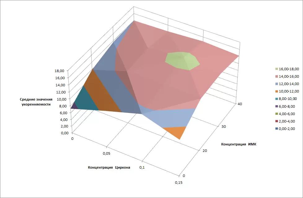 Посчитаны средние значения укореняемости для каждого варианта, результаты представлены на трехмерном графике 1.