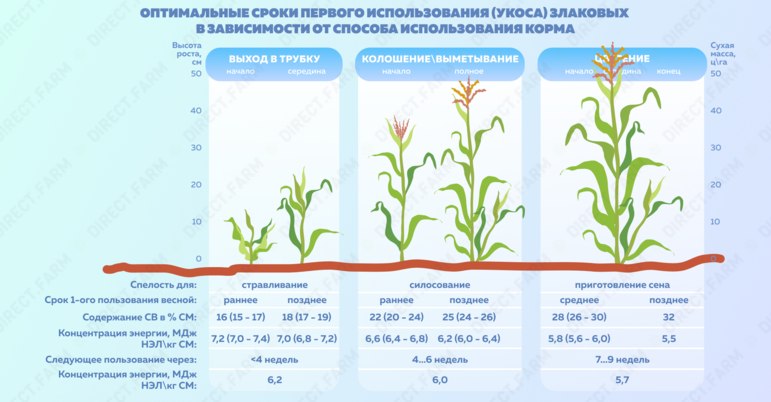 В процессе кормозаготовки злаковых культур важное значение имеет соблюдение оптимальных сроков уборки. Так как содержание сырого волокна каждый день растет, в зависимости от погоды, на 0,3-0,5%, оптимальный срок уборки, как правило, не более 10 дней.