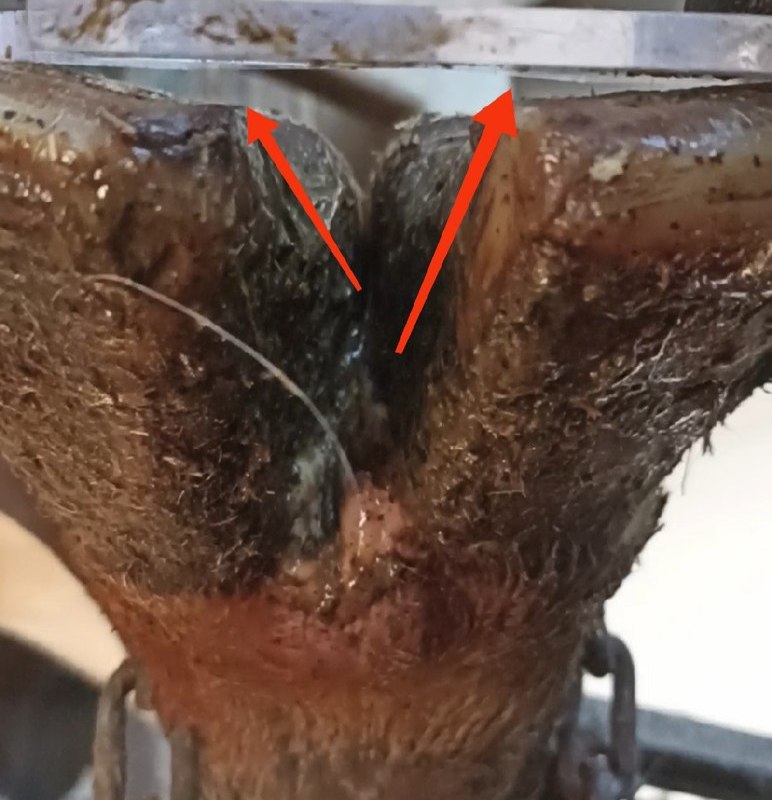 - Фото №3: чрезмерно срезанная пяточная часть копытца, не соответствующая стандарту 3,5-4,5 см. Данное нарушение приводит к увеличению нагрузки на связочный аппарат с последующим развитием патологий в виде артритов, артрозов, деформации суставов. Из-за опущения пяточной части, кожа венчика копытца более подвержена загрязнению, мацерации, что может способствовать распространению случаев заболевания Мортелларо в стаде.