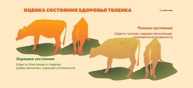 - Здоровый теленок имеет гладкую, блестящую шерсть. Его рубец (слева) наполнен; в рубце должно содержаться достаточное количество клетчатки (при нажатии рубец проминается). Упитанность оценивают по объему мускулатуры над поясничными позвонками позади ребер, где хорошо заметны мышцы. Для оценки развития мускулатуры и жироотложения рекомендуется ощупывать животных руками.