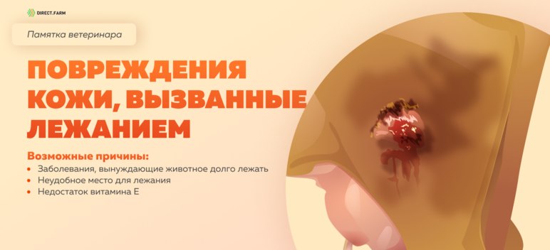 - Предшественником пролежней часто является первичное заболевание, которое заставило животное долго лежать. Заболевания, вынуждающие животное долго лежать: хромота, кетоз, послеродовой парез, метрит, мастит, травмы, пневмония, инфекционные заболевания.