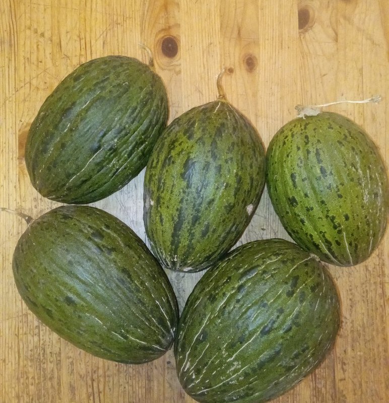 Ребята, эксперимент продолжается. В этом году сажали дыню Санта- Клауса. Именно так ещё называют гибриды дыни сортотипа Пиель де Сапо. Их фишка - возможность длительного хранения, конечно, при определенных условиях. Сняли мы их с бахчи в сентябре. На сегодня, 5 декабря, полет нормальный. Кора твердая, как у тыквы, цвет оливковый с желтыми и коричневыми пятнами. В среднем 2-2.5 кг. Санты у нас нет, но, полагаю, деда Мороза угостим.