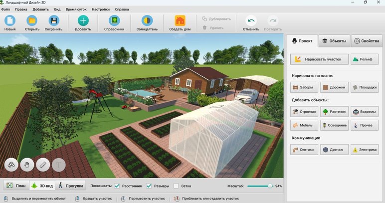 Визуализируйте план в специализированной программе, например в Ландшафтном Дизайне 3D, чтобы проверить расстановку всех объектов и их соответствие нормативам.