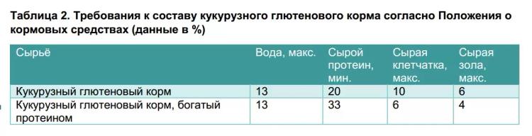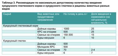 Оба вида кукурузного глютенового корма используются преимущественно в кормлении жвачных (таблица 3) из-за значительного содержания сырой клетчатки (таблица 2). Кукурузный глютен, который содержит меньше сырой клетчаткой и, тем самым, имеет лучшую перевариваемость, тоже может использоваться в рационах моногастричных животных только в ограниченном количестве из-за плохого качества протеина (прежде всего бедного лизином) (см. таблицу 3). При обогащении рецептур синтетическими аминокислотами (особенно лизином) процент введения этого корма может быть повышен без потерь в продуктивности.