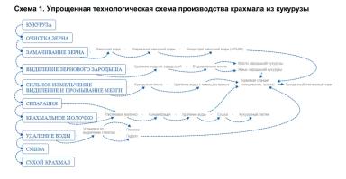Процесс производства кукурузного крахмала упрощенно показан на схеме 1. При этом образуются несколько побочных продуктов с различным содержанием питательных веществ и разной кормовой ценностью. Это по порядку возникновения замочная кукурузная вода, жмых кукурузных зародышей, кукурузная мезга и кукурузный глютен.