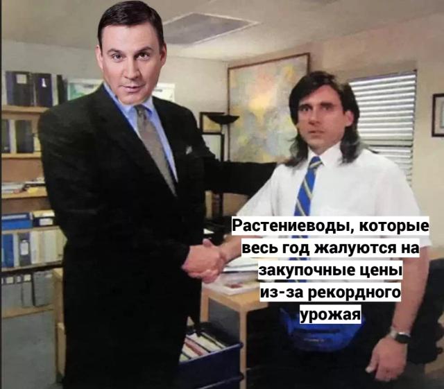 Но что ещё более важно - на самом деле сегодня в себестоимости хлеба, мяса и молока затраты на сырье, то есть зерно или муку, занимают далеко не первое место. Гораздо больше животноводы и пищевики тратят на налоги, зарплаты, на логистику, оплату жилищно-коммунальных услуг и так далее. Это значит, что даже падение цен на зерно в два раза приведёт к снижению себестоимости всего лишь на несколько процентов. Как говорится, в рамках статистической погрешности. Зато такое падение гарантированно разорит огромное количество агропредприятий, особенно небольших фермерских хозяйств, у которых нет финансовой подушки безопасности и которые живут буквально от урожая к урожаю. Конечно, в реальной жизни падение закупочных цен в два раза малореально. Однако по данным аналитической компании "ПроЗерно", на середину марта пшеница третьего класса стоила на 25 процентов дешевле, фуражный ячмень - на 35, подсолнечник - почти на 45 процентов меньше, чем годом ранее. С учетом быстро растущих расходов ситуация в отрасли очень и очень непростая.