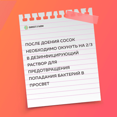 Просвет соска остается открытым в течение некоторого времени после доения, поэтому рекомендуется его обработка путем окунания в дезинфицирующий раствор, что предотвращает попадание бактерий. Соски должны быть покрыты на 2/3 антисептическим средством.