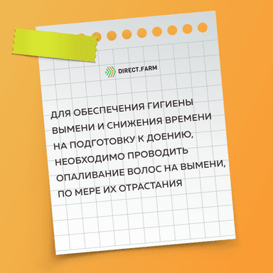 Рекомендуется: для обеспечения более чистого вымени, и снижения времени на подготовку коровы, его следует регулярно, по мере отрастания волос, обжигать от волосяного покрова в зоне сосков, а также купировать хвосты, либо обрезать волосяной покров с хвостовой кисточки.