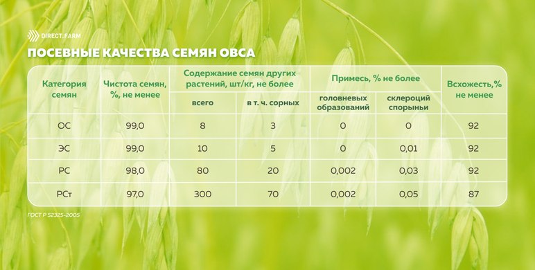 Посевные качества семян овса должны соответствовать требованиям ГОСТ Р 52325-2005.