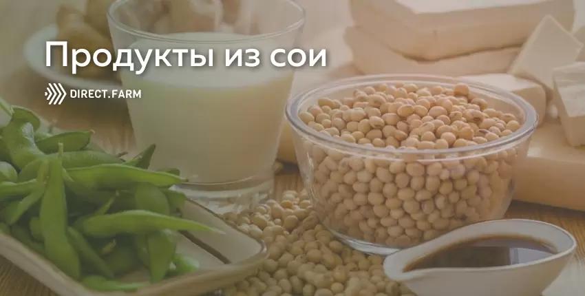 Из сои можно производить огромное количество продуктов питания: соевая мука, соевое масло, соевое молоко, соевое мясо, соевая паста, соевый соус, мисо, темпе, соевый сыр тофу, эдамамэ, натто, юбе и хумус. Соевый белок добавляют в колбасные изделия.