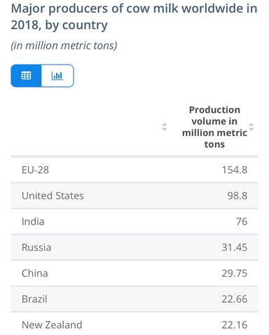 - На второй позиции Европейский Союз – 33,3 млн. тонн, при этом, ЕС в 2018 году являлся лидером в производстве молока (154,8 млн. тонн).