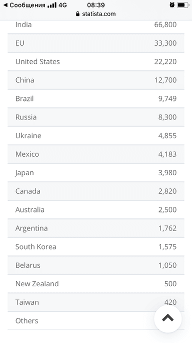Россия оказалась на 6 позиции из ТОП-16 представленных стран – 8,3 млн. тонн. Потребление молока в России на душу населения составляет – 57,65 кг.