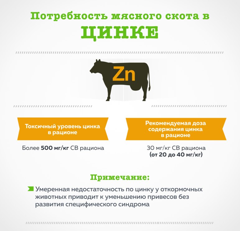 Максимально допустимый уровень цинка в размере 500 мг/кг, но при даче бычкам-кастратам рационов, содержащих 1000 мг/кг цинка, в течение 13-18 месяцев, их продуктивность существенно не уменьшается.