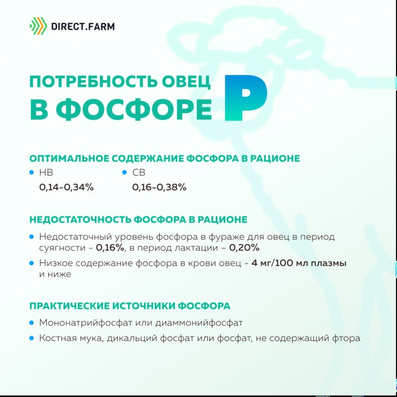 - Уровнем фосфора в фураже, недостаточным для овец в период суягности, является 0,16%, а для овец в период лактации – 0,20%.