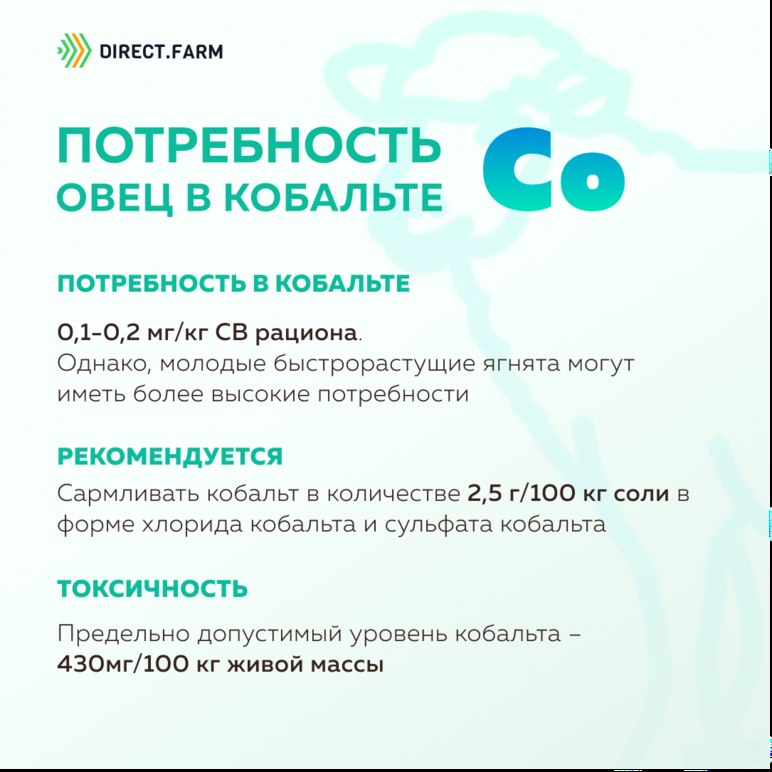 ◼Потребность в кобальте - 0,1-0,2 мг/кг СВ рациона. Однако, молодые быстрорастущие ягнята могут иметь более высокие потребности.
