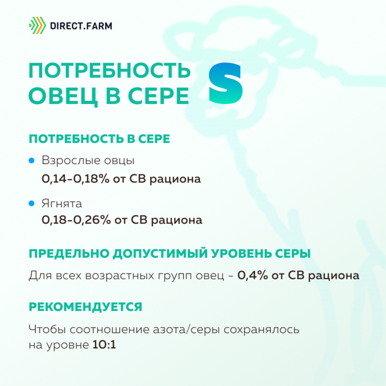 ◼Токсичность. Предельно допустимый уровень серы для всех возрастных групп овец - 0,4% от СВ рациона.