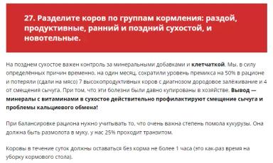 27. Разделите коров по группам кормления: раздой, продуктивные, ранний и поздний сухостой, новотельные. На позднем сухостое важен контроль за минеральными добавками и клетчаткой. Минералы с витаминами в сухостое действительно профилактируют смещение сычуга и проблемы кальциевого обмена!