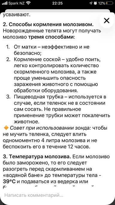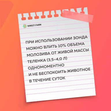 🔸Совет при использовании зонда: можно влить 10% объема молозива от живой массы теленка (3,5-4 л молозива) одномоментно и не беспокоить теленка в течение суток. Но будьте осторожны! Неправильное применение зонда может повредить пищевод теленка, а также можно влить молозиво в трахею, что погубит животное.