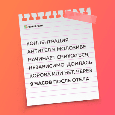- Концентрация антител в молозиве начинает снижаться, независимо доилась корова или нет, через 9 часов после отела;