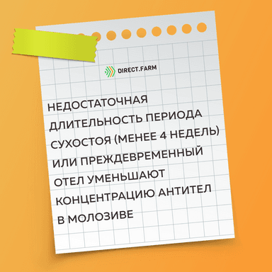 - Недостаточная длительность периода сухостоя (менее 4 недель) или преждевременный отел уменьшают концентрацию антител в молозиве;