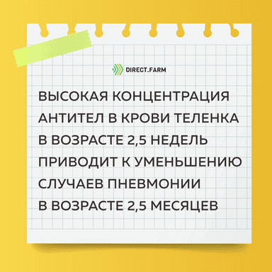 🔸Факт: высокая концентрация антител в крови теленка в возрасте 2,5 недель приводила к уменьшению случаев пневмонии в 2,5 месячном возрасте.