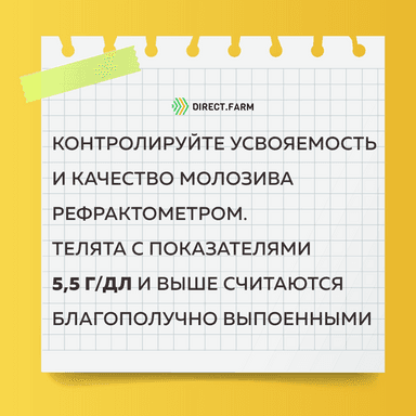 Чтобы проконтролировать усвояемость и качество молозива, а также работу сотрудников вашей фермы, рекомендуется через 2-3 дня после рождения проверить содержание общего протеина в сыворотке крови (иммуноглобулины составляют лишь часть общего белка крови, но находятся в прямой пропорции с ним у телят в возрасте до 3 дней) у выборочных телят рефрактометром. Телята с показателями 5,5 г/дл и выше считаются благополучно выпоенными, хорошим молозивом и вовремя.