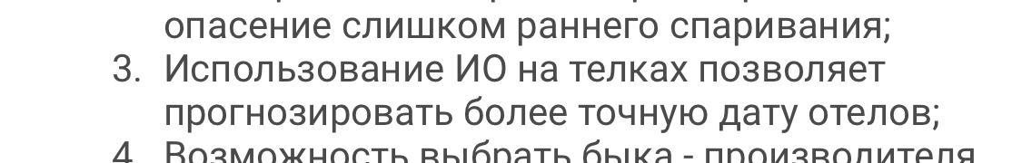 - При покупке замороженного семени можно подобрать быка по таким факторам, как легкость отела, наследуемость продуктивности, форме вымени и т.д.. ИО помогает упростить уход за телками, позволяя содержание на одном пастбище телок разного возраста и размера без опасение слишком раннего спаривания;
