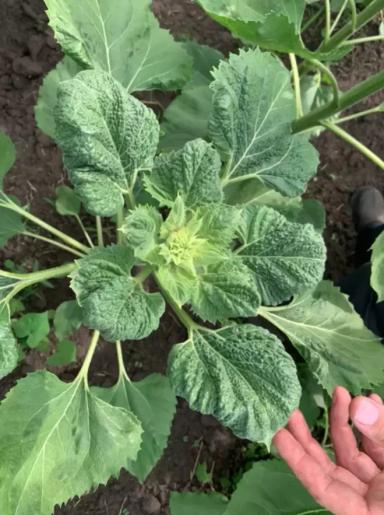 2️⃣Эти симптомы похожи и на избыточное внесение бора. Об этом свидетельствуют так называемые «пупырышки» на листьях подсолнечника. Передозировка бора также может приводить к деформации и искривлению листьев, вплоть до отсутствия завязывания корзинки. В этом случае стебель будет без корзинки.