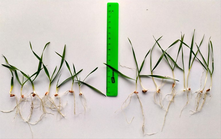 2. С точки внешнего вида посевов, та часть, образцы из которой находятся на фото справа от линейки, выше над уровнем поверхности почвы.