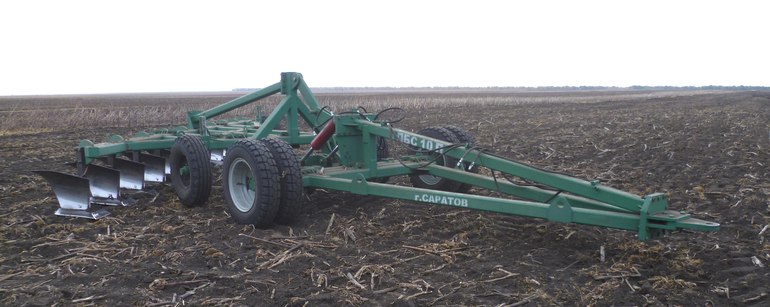 Для основной отвальной обработки почвы на больших площадях в короткие сроки требуется значительно наращивать производительность пахотных агрегатов. Сегодня все больше сельхозтоваропроизводителей применяют тракторы большой мощности 250-300кВт иностранных компаний (Fendt, Challenger, Maasei Fergusson, Case IH, John Deer, Claas, New Holland, Versatile и др.). Не все тракторы оснащены навесной системой и агрегатируют почвообрабатывающие орудия в прицепном варианте. Нами разработан прицепной лемешно-отвальный плуг ПБС-10П шириной захвата 6м. Габаритные размеры плуга: длина 12088, ширина 5990 и высота 1762мм. Масса плуга 4200кг. Количество корпусов 10шт, шириной захвата 60см.