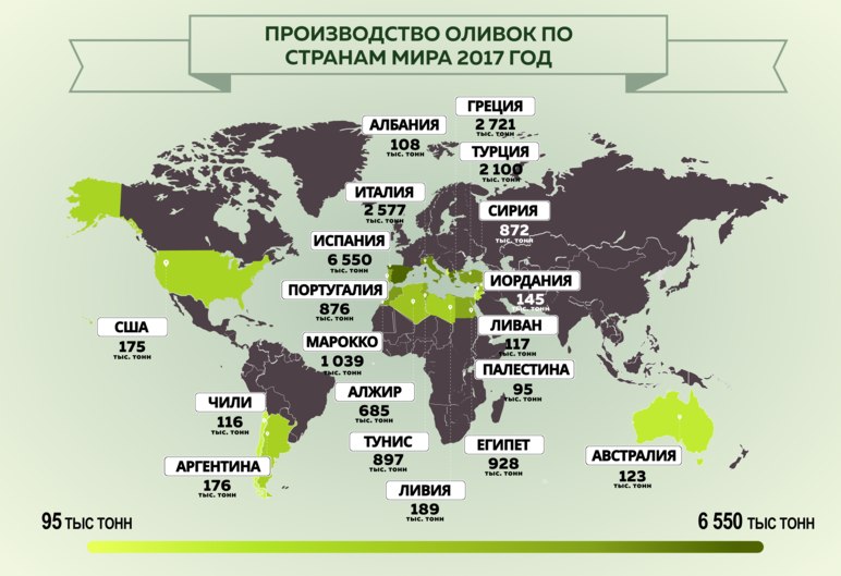 В целом, мировое производство оливок сейчас на подъеме. Лидерами среди стран-производителей оливок являются Испания, Греция и Италия. Кроме того, их активно выращивают в Марокко, Сирии, Египте, Португалии и Алжире.