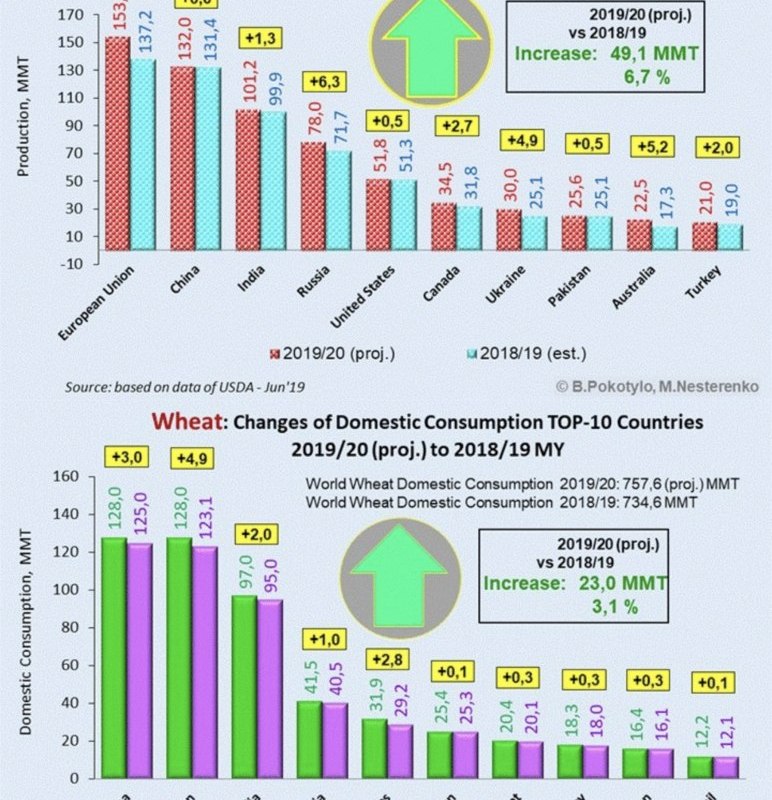 Производство/потребление пшеницы по основным странам (сравнение 18/19 с 19/20)