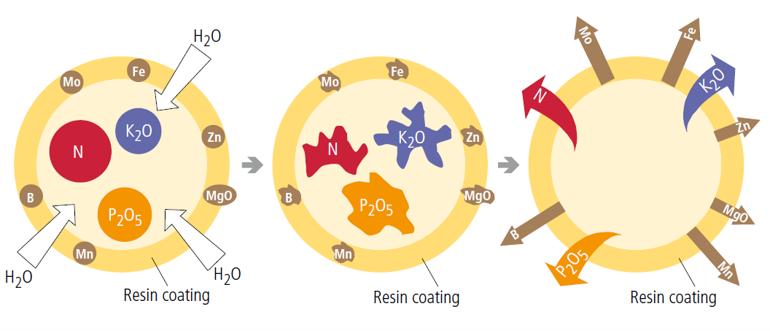 Зачем же так заморачиваться с оболочками, спросите вы. Вся прелесть в том, что каждая гранула покрыта органической полупроницаемой оболочкой из биоразлагаемой смолы, полученной из растительных жиров и полимера. После внесения удобрения вода проникает через полупроницаемую оболочку и начинает растворять питательные элементы внутри гранулы, выделение которых начинается после их растворения благодаря разнице в осмотическом давлении. Удобрение начинает действовать через 1–2 недели при температуре, выше температуры замерзания, что зависит от параметров удобрения (размеры пор, толщина оболочки). Оптимальная температура для высвобождения - 21ºС.