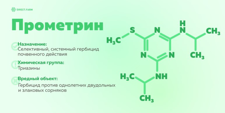 ⏺Период защитного действия: гербицидное действие прометрина в почве сравнительно короткое. В практических условиях продолжительность его действия составляет примерно 1-3 месяца (зависит от дозировки, рода почвенной характеристики, активности почвенных микроорганизмов и погоды).