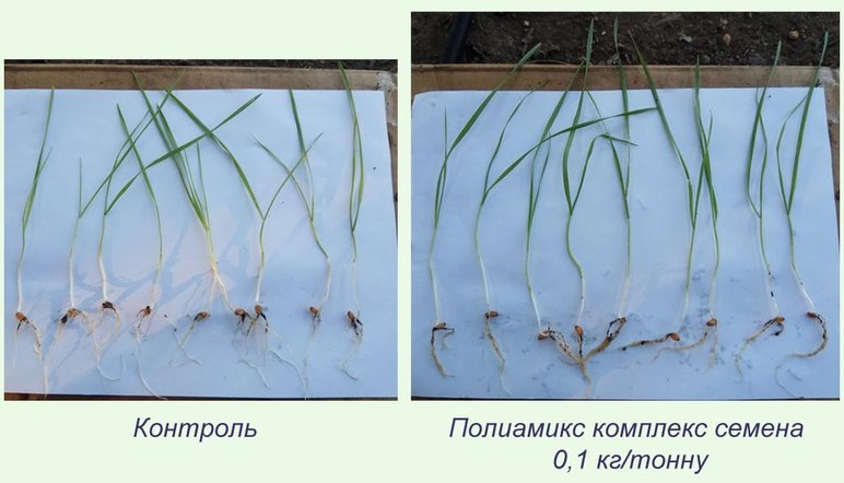 Проверили на небольшой делянке, обработка и высев ручной. Контроль - обработка просто водой, опытный вариант - обработка препаратом "Полиамикс семена".