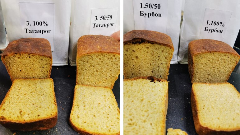 Главное же заключалось в том, что предприятие ведет поиск перспективных культур для изготовления продукции, предназначенной особому кругу покупателей из числа гурманов с уклоном здорового питания и готовым платить за нее немалые деньги. В этих целях из зерна была получена цельно-зерновая мука, и выпечен хлеб как из 100% индивидуального сорта твердой пшеницы, так и в смеси с хлебопекарной мукой высшего сорта своего же производства. Участники встречи с огромным интересом продегустировали каждый образец свежевыпеченного хлеба, и, хотя, мнения разошлись по предпочтениям каждого сорта, но общим и единодушным было то, что хлеб из твердой пшеницы необыкновенно вкусный и обладает неповторимым вкусом и ароматом каждого сорта, но и кардинально отличается от привычной нам хлебной продукции. Хороши были и смесевые варианты с мукой из мягкой пшеницы, кстати, все они на 1-2 см выше, чем 100% оригиналы, за счет того, что хлебопекарная мука поднимается выше, и хлеб имеет большие поры при брожении. Также следует отметить, что каждый сорт хлеба абсолютно соответствует описанию сорта твердой пшеницы, указанной в брошюре «Агролиги» по твердой пшенице. Так, у Таганрога самая желтая хлебная мякоть, у Бурбона цвет чуть ниже, зато плотность хлеба и его консистенция очень однородная и необыкновенно приятная на вкус.