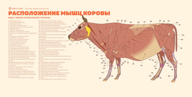 Прямая мышца живота начинается от нижних концов четвертого-девятого реберных хрящей и грудной кости и оканчивается на лонном гребне. Мышечные пучки идут спереди назад вдоль белой линии живота и имеют пять сухожильных перемычек. Мышца заключена в сухожильное влагалище, образованное апоневрозами наружной и внутренней косых мышц живота (наружная пластинка), поперечной мышцы и внутрибрюшной фасции (внутренняя пластинка). В области второй (третьей) сухожильной перемычки у коровы располагается молочный колодец для прохождения подкожной брюшной вены.