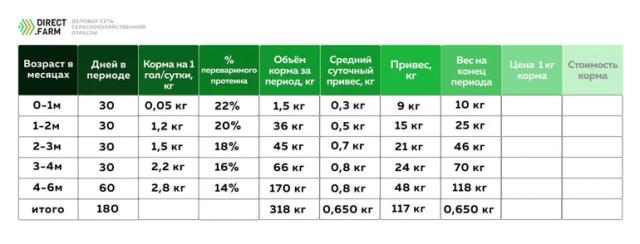 Длится с 30 кг до достижения 60–65 кг. Среднесуточный привес должен составлять 400–550 г и более. Рекомендуемый состав рациона: